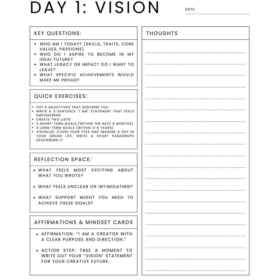 Welcome, Creator! You’ve just stepped into a space designed to support, celebrate, and strengthen your creative vision as you work through the Vision to Execution Creative Clarity Guidebook. This is more than a workbook — it’s a launchpad that transforms your ideas into actionable steps, perfectly aligned with Think All Be All’s commitment to empowering creative entrepreneurs. Join a vibrant community of dreamers and doers who, like you, are ready to turn inspiration into impact. With live training courses and hands-on guidance, this guidebook fuels your journey from concept to creation with clarity and confidence.